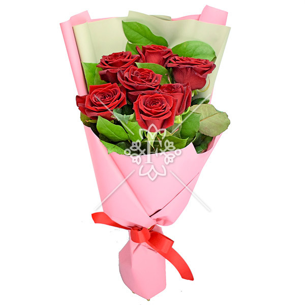 Роза красная - 7 шт., зелень декоративная, упаковка, лента.